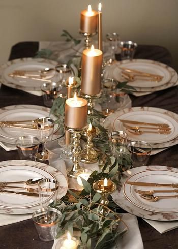 One of my favorite trends are long stem candles in gold bases cascading down along family style table. Incorporating different sizes, heights, and even colors of candles can bring in instant romance to your space. Be sure and check with your venue to make sure if you can have a live flame in your space.