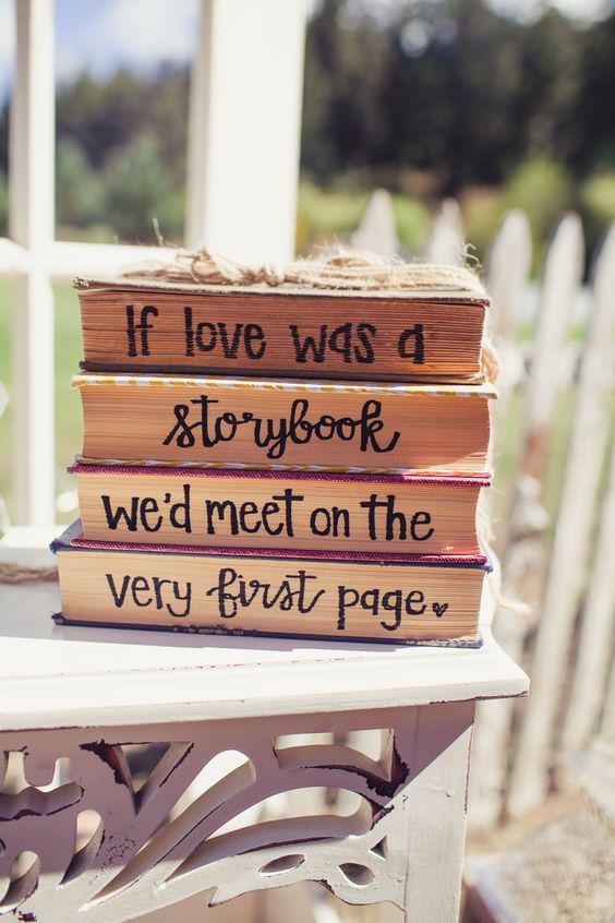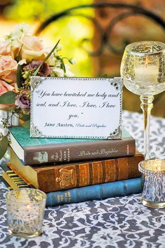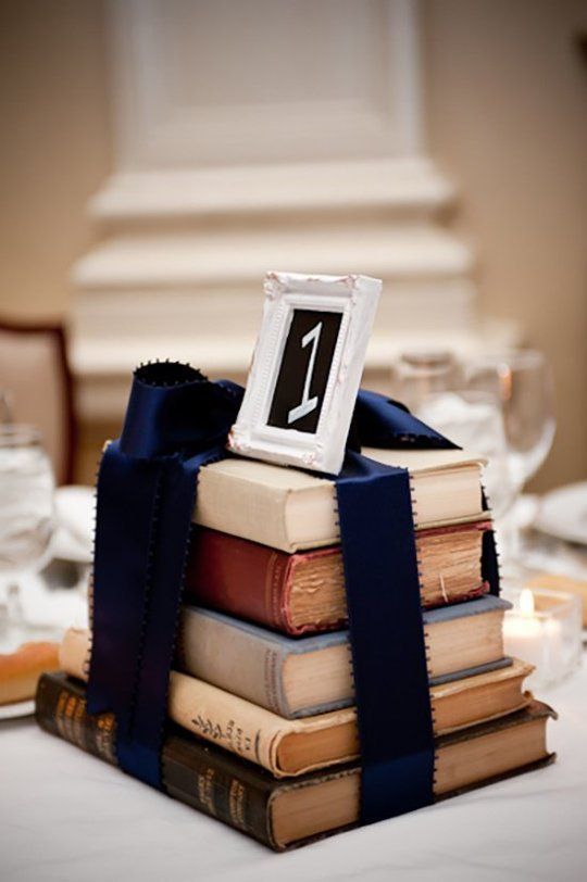 Books make a great centerpiece for any event with a vintage or whimsical theme. Old leather bound books can be antiques, found at a yard sales, or thrift shops! Stack them in the middle and maybe put T lights around them or on top. You can also incorporate pearls or loose China to add to the whimsical look.