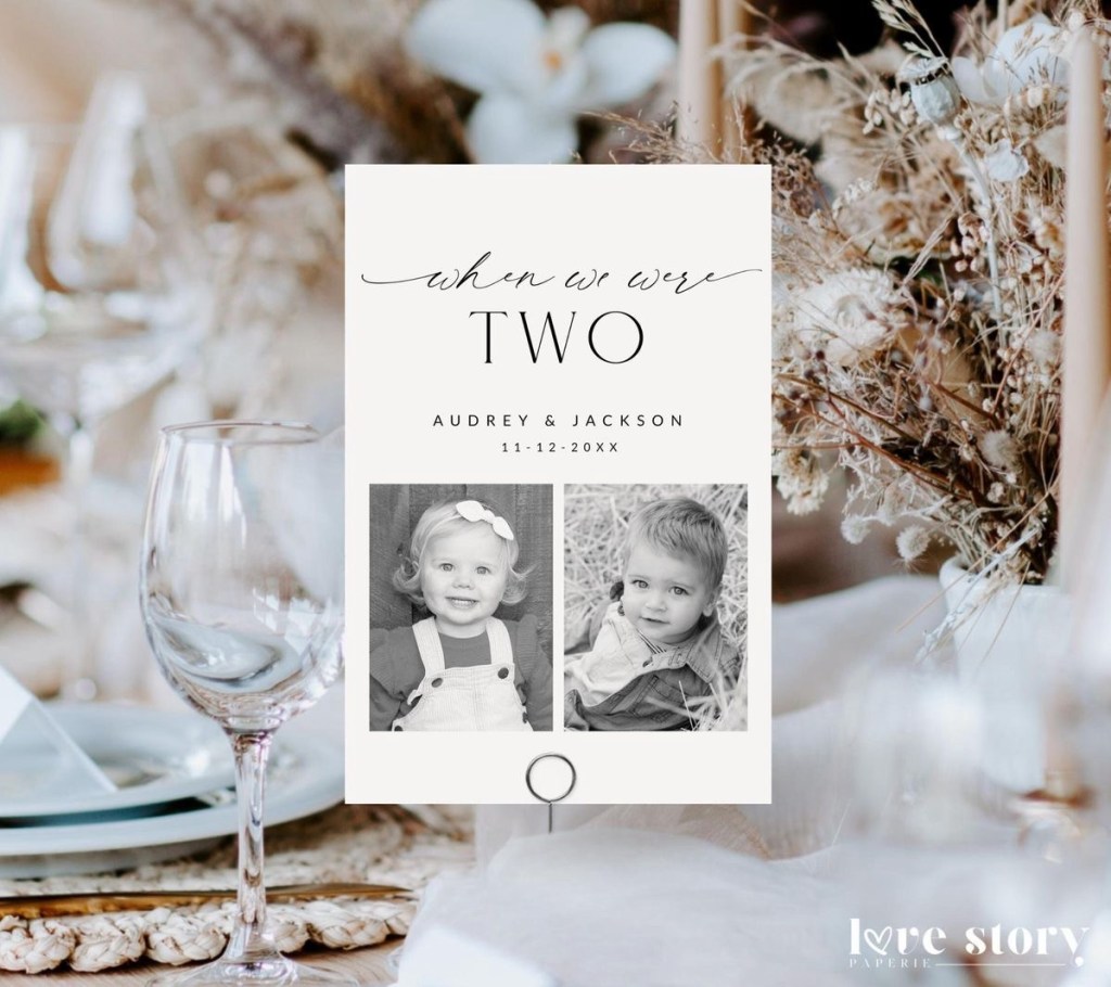 Dual purpose – I love how practical and pretty these look. Having the menu on the table number gives your guest that extra detail without having to print individual menu cards. The third side could feature a photo of the couple, fun facts or a schedule of events for the evening to name a few ideas. These are also easy on the budget and can be made in Canva.