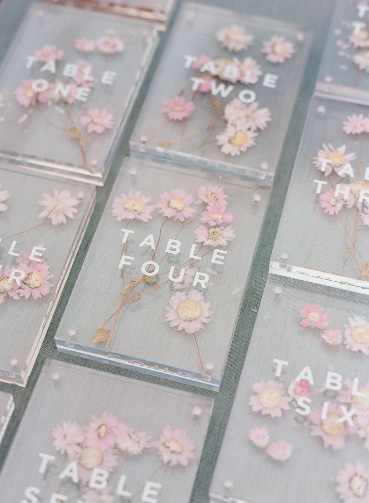 Pressed and pretty – These acrylic frames look so soft and elegant with pressed flowers behind the table number.
